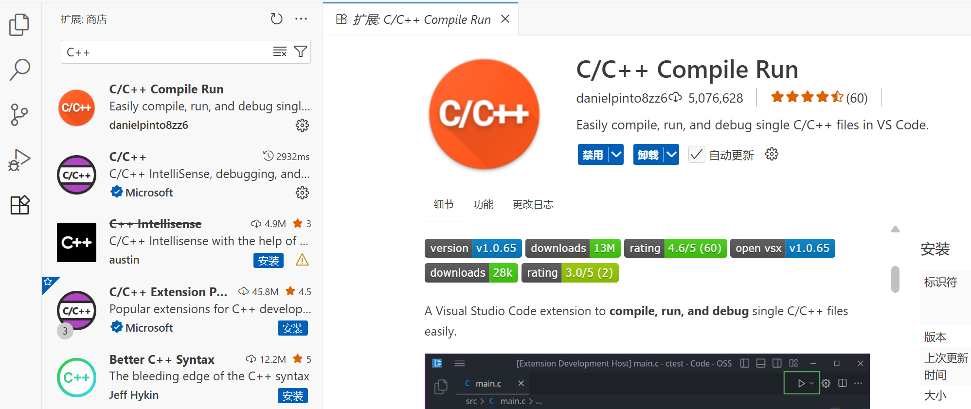 ,找到 C/C++ Compile Run,点击「安装/Install」即可。